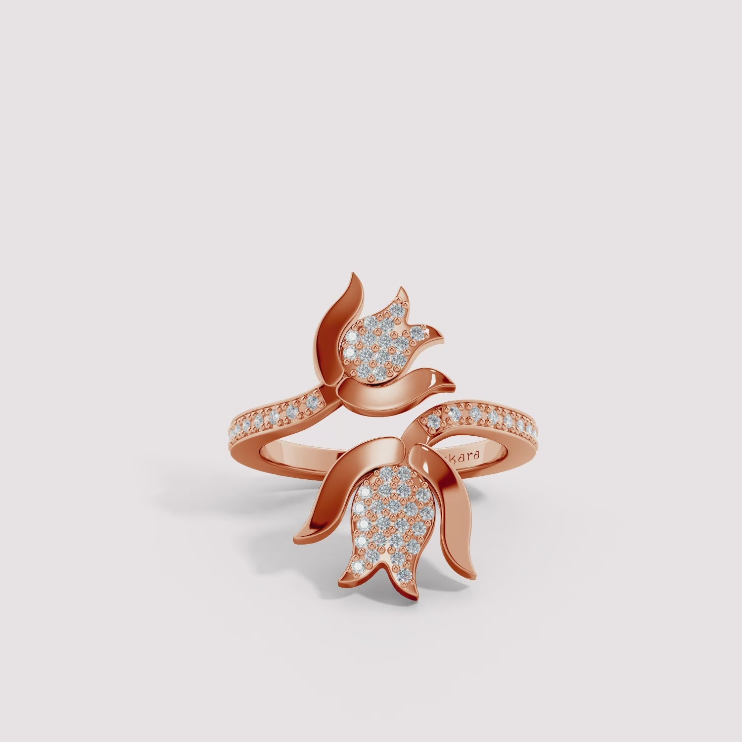 Tulip Charm diamond ring adorned with round brilliant cut stones.